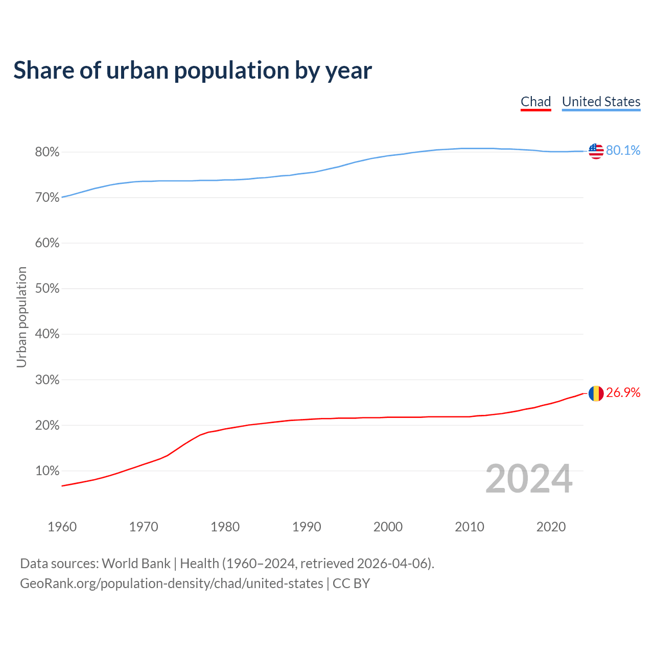 From 2004 to 2024, the share of urban population changed from 21.7% to 26.9% in Chad and from 80% to 80.1% in the United States.