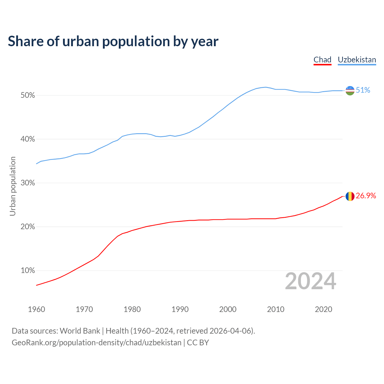 From 2004 to 2024, the share of urban population changed from 21.7% to 26.9% in Chad and from 50.6% to 51% in Uzbekistan.