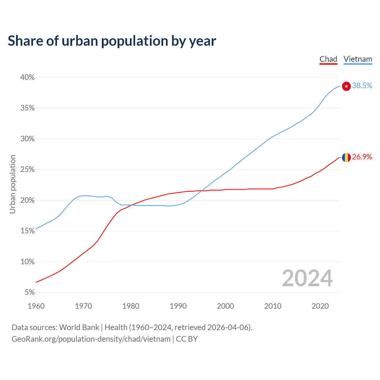 From 2004 to 2024, the share of urban population changed from 21.7% to 26.9% in Chad and from 26.8% to 38.5% in Vietnam.