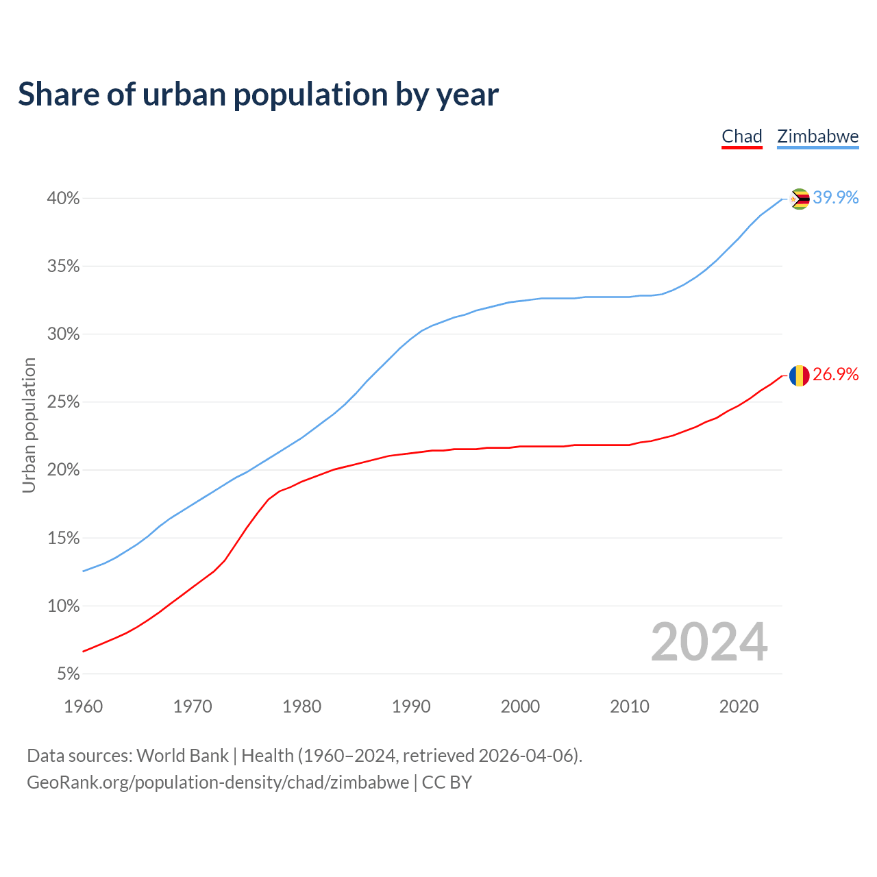 From 2004 to 2024, the share of urban population changed from 21.7% to 26.9% in Chad and from 32.6% to 39.9% in Zimbabwe.