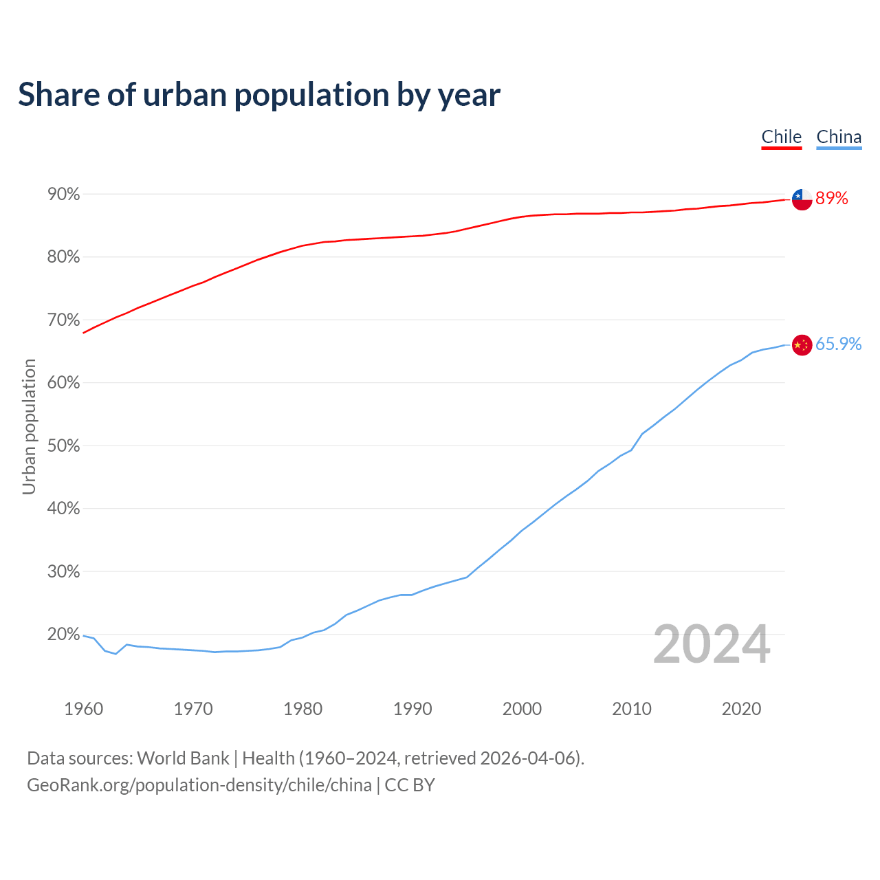 From 2004 to 2024, the share of urban population changed from 86.7% to 89% in Chile and from 41.8% to 65.9% in China.
