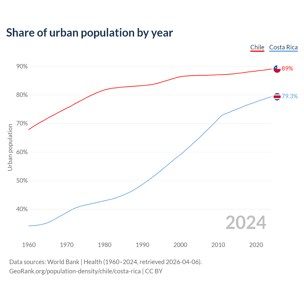 From 2004 to 2024, the share of urban population changed from 86.7% to 89% in Chile and from 63.7% to 79.3% in Costa Rica.