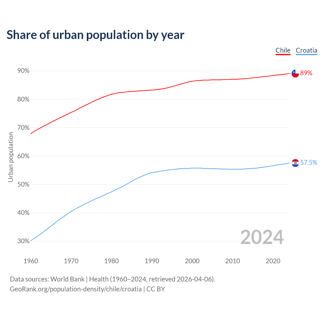 From 2004 to 2024, the share of urban population changed from 86.7% to 89% in Chile and from 55.6% to 57.5% in Croatia.