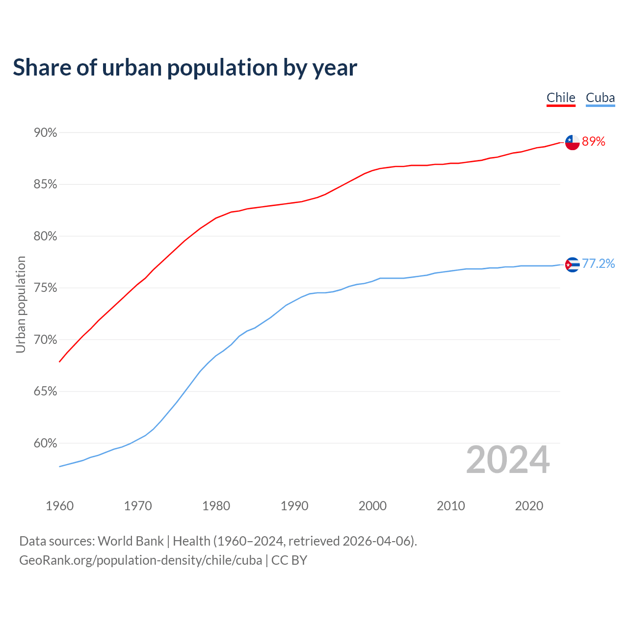 From 2004 to 2024, the share of urban population changed from 86.7% to 89% in Chile and from 75.9% to 77.2% in Cuba.