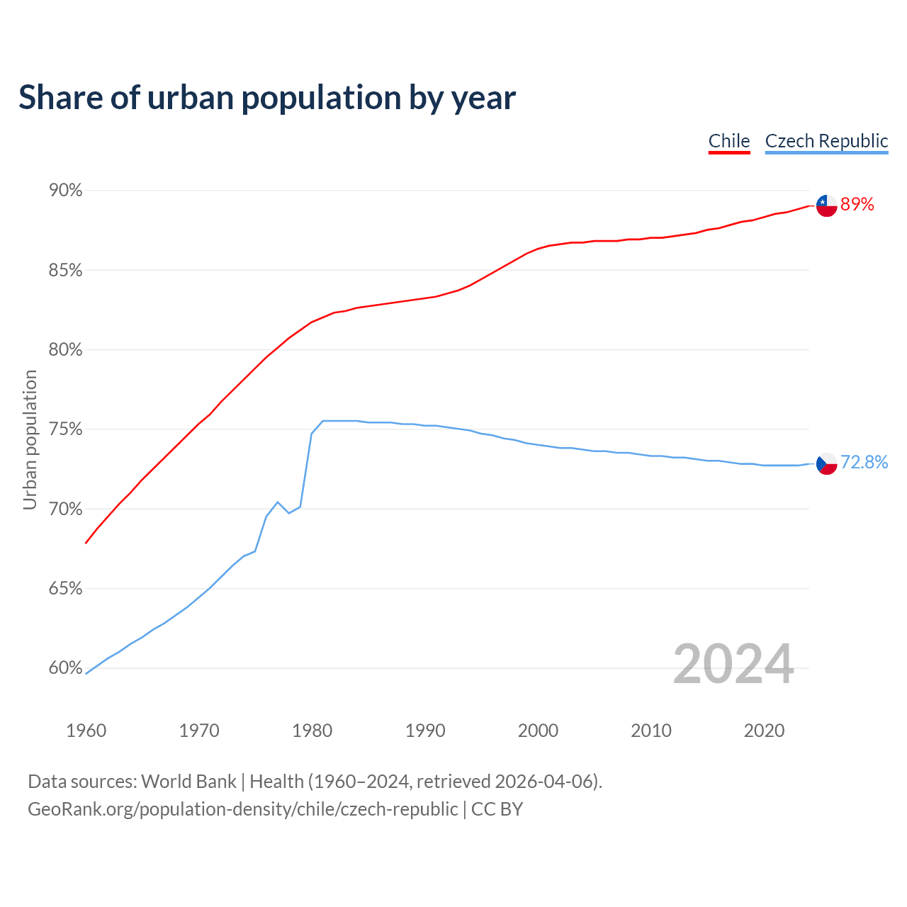From 2004 to 2024, the share of urban population changed from 86.7% to 89% in Chile and from 73.7% to 72.8% in the Czech Republic.