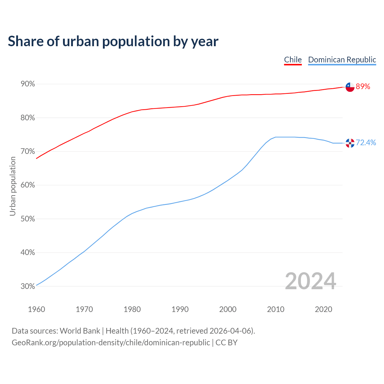 From 2004 to 2024, the share of urban population changed from 86.7% to 89% in Chile and from 65.9% to 72.4% in the Dominican Republic.