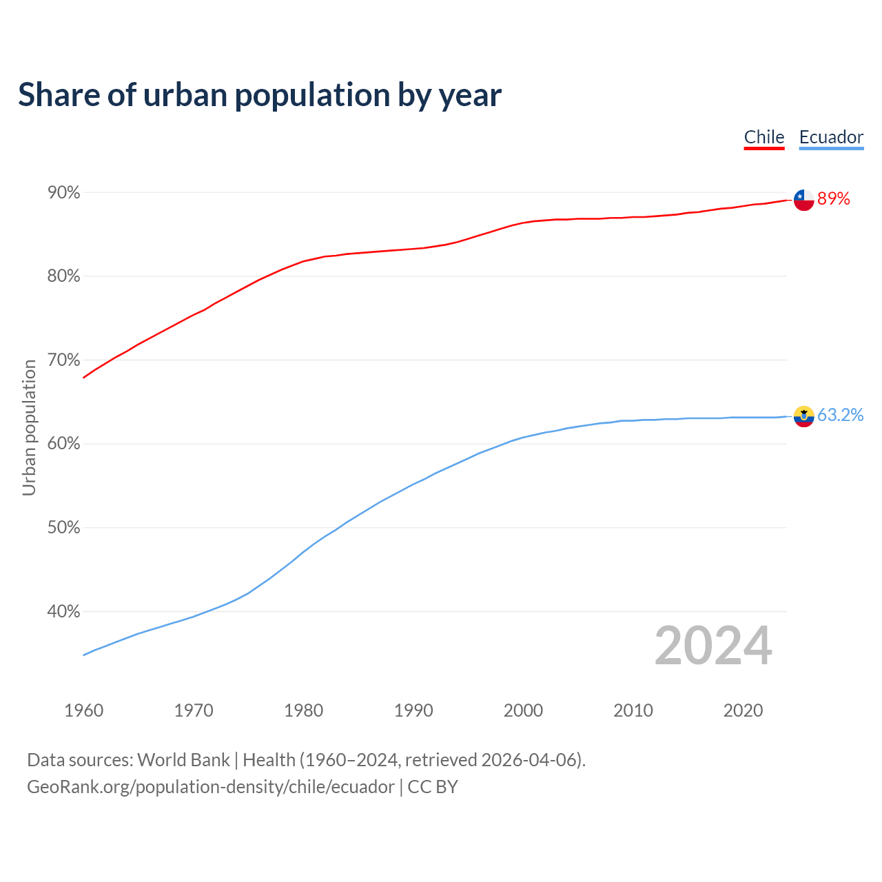 From 2004 to 2024, the share of urban population changed from 86.7% to 89% in Chile and from 61.8% to 63.2% in Ecuador.
