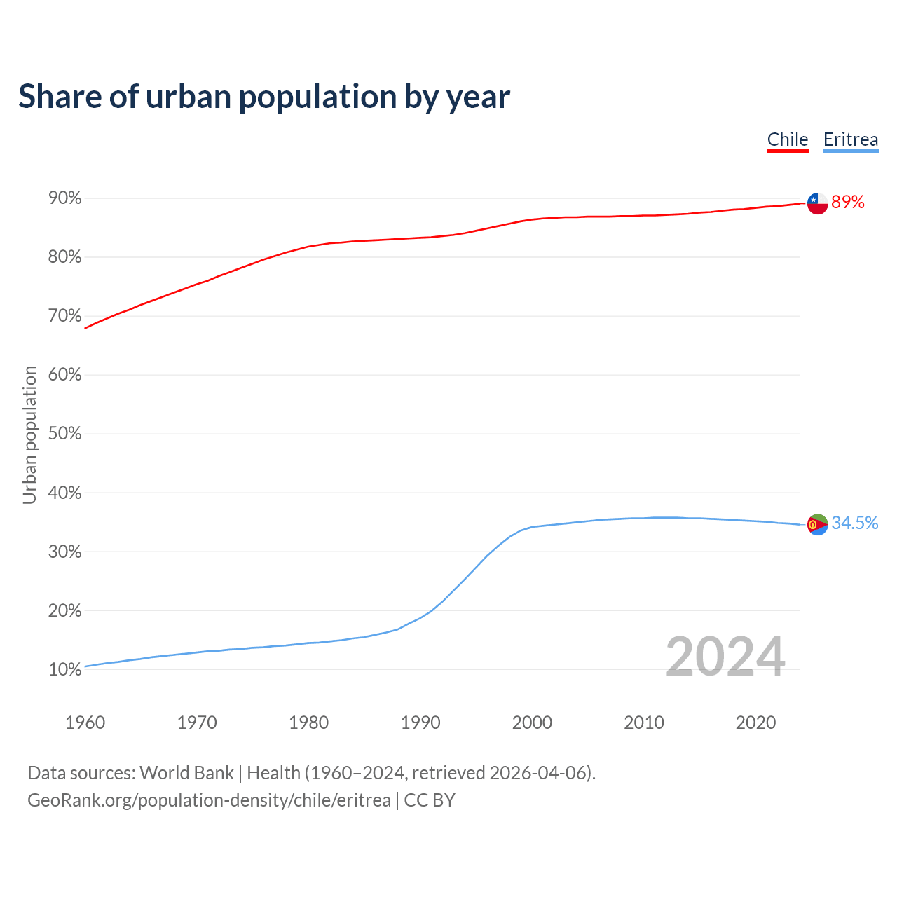 From 2004 to 2024, the share of urban population changed from 86.7% to 89% in Chile and from 34.9% to 34.5% in Eritrea.