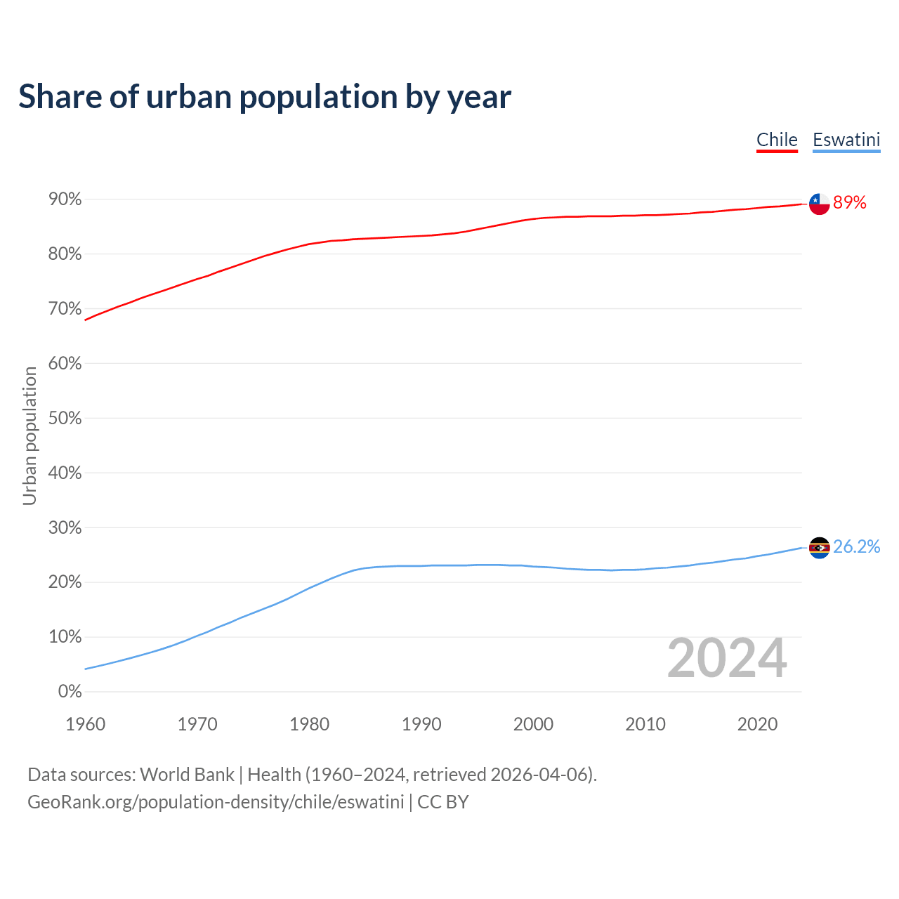 From 2004 to 2024, the share of urban population changed from 86.7% to 89% in Chile and from 22.3% to 26.2% in Eswatini.