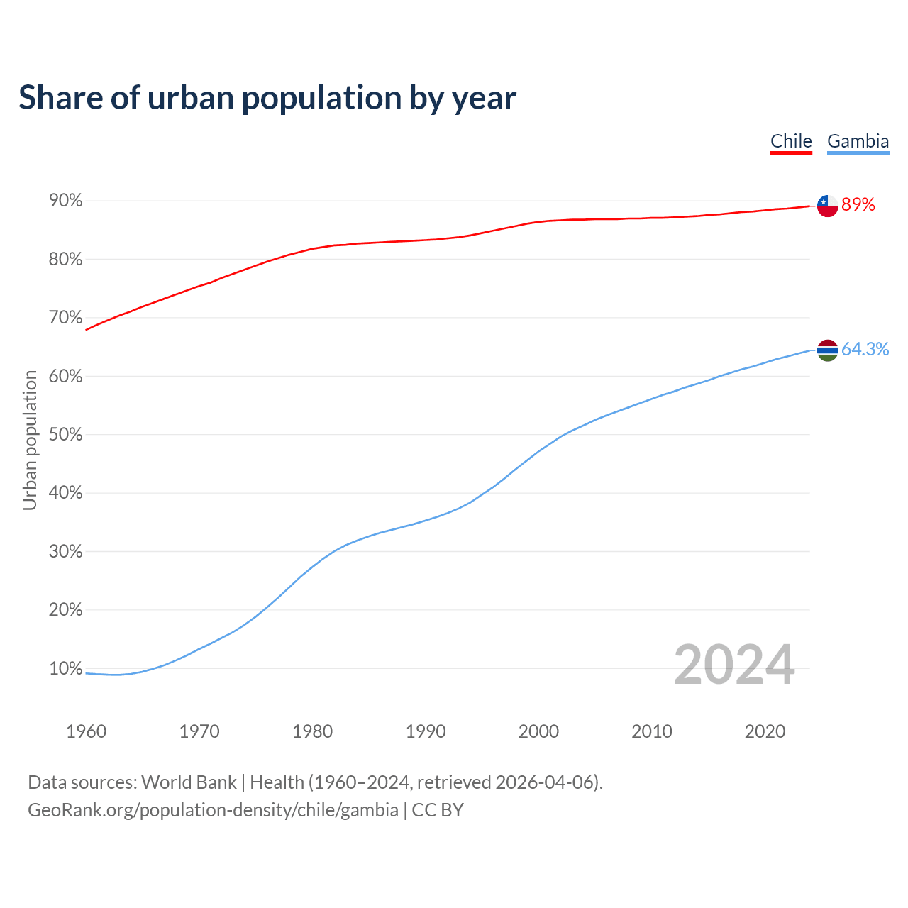 From 2004 to 2024, the share of urban population changed from 86.7% to 89% in Chile and from 51.5% to 64.3% in the Gambia.