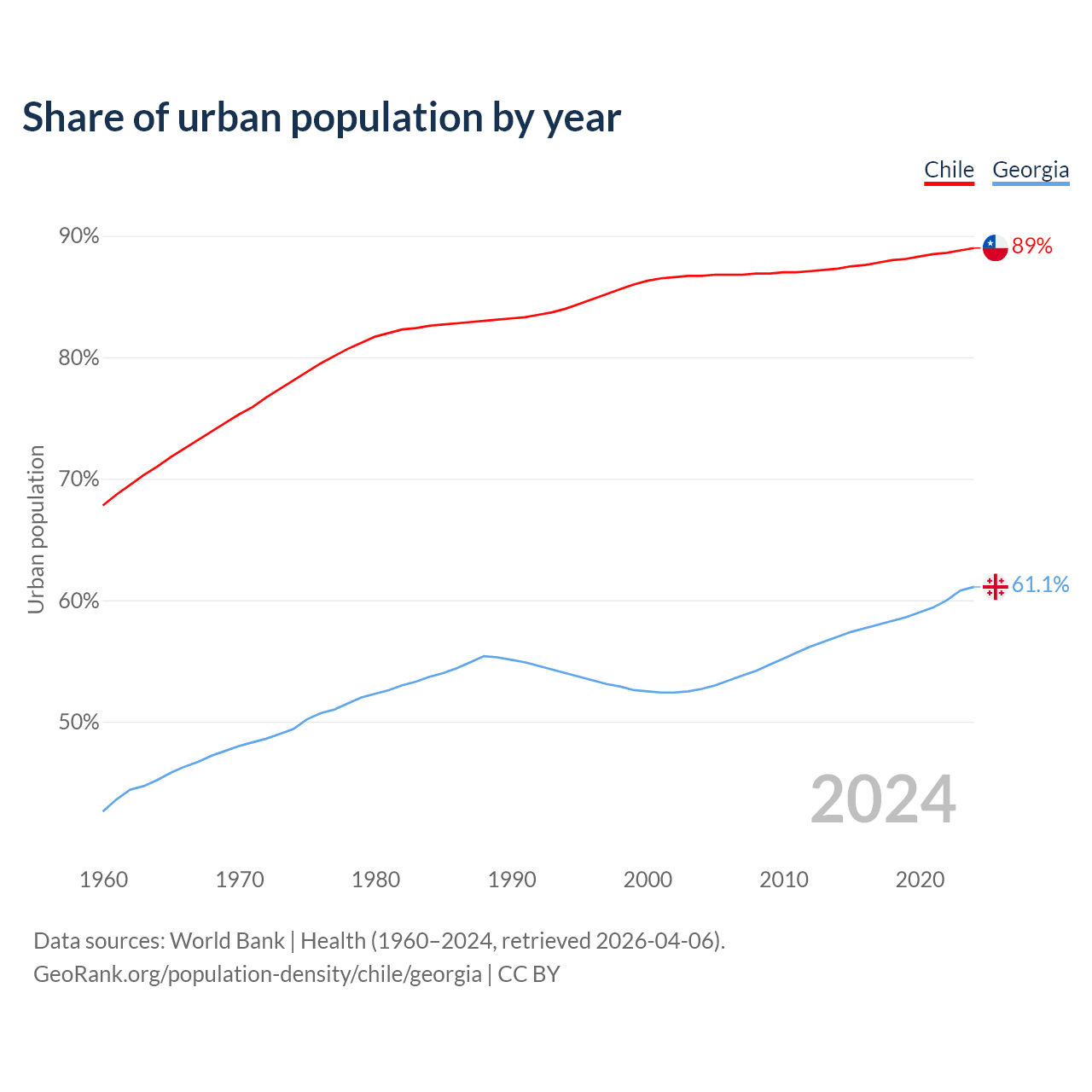 From 2004 to 2024, the share of urban population changed from 86.7% to 89% in Chile and from 52.7% to 61.1% in Georgia.