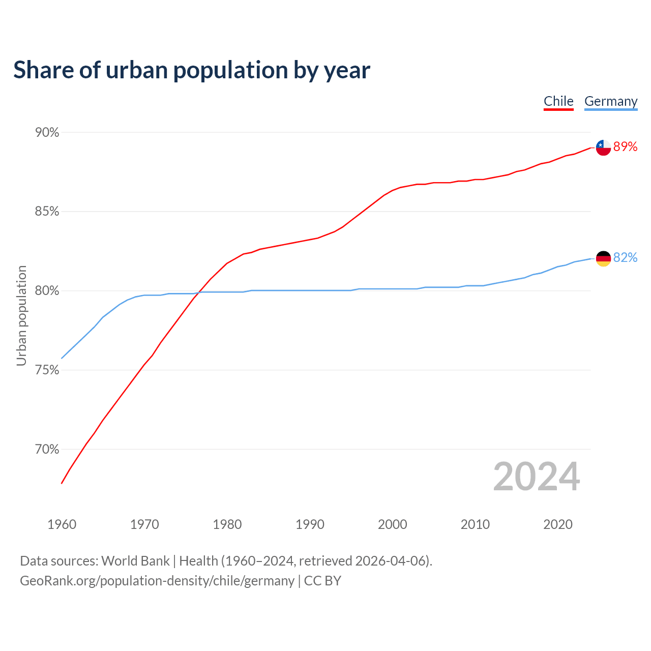 From 2004 to 2024, the share of urban population changed from 86.7% to 89% in Chile and from 80.2% to 82% in Germany.