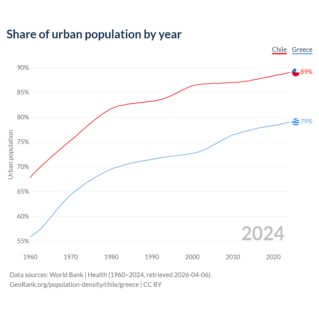 From 2004 to 2024, the share of urban population changed from 86.7% to 89% in Chile and from 73.8% to 79% in Greece.