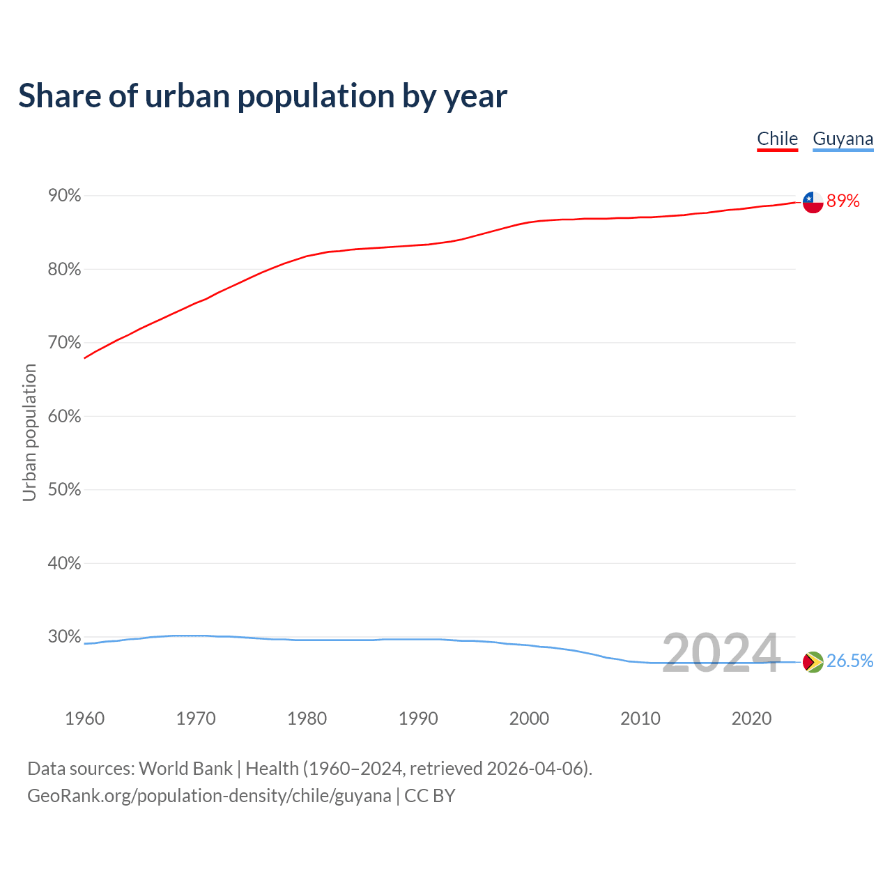From 2004 to 2024, the share of urban population changed from 86.7% to 89% in Chile and from 28.1% to 26.5% in Guyana.