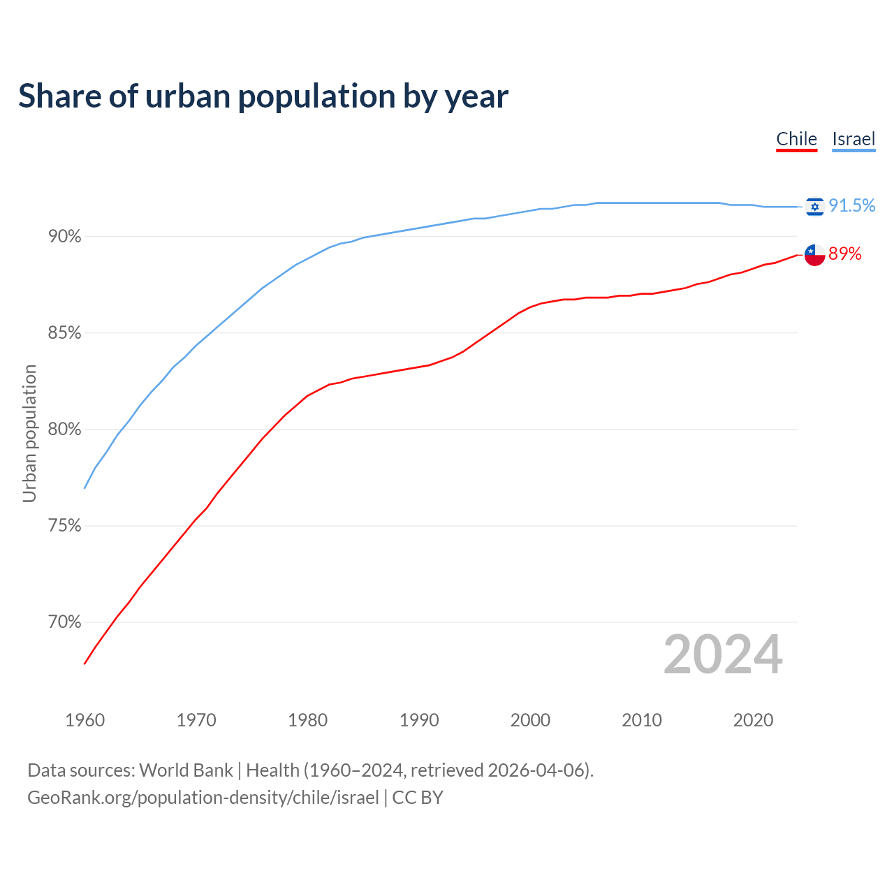 From 2004 to 2024, the share of urban population changed from 86.7% to 89% in Chile and from 91.6% to 91.5% in Israel.