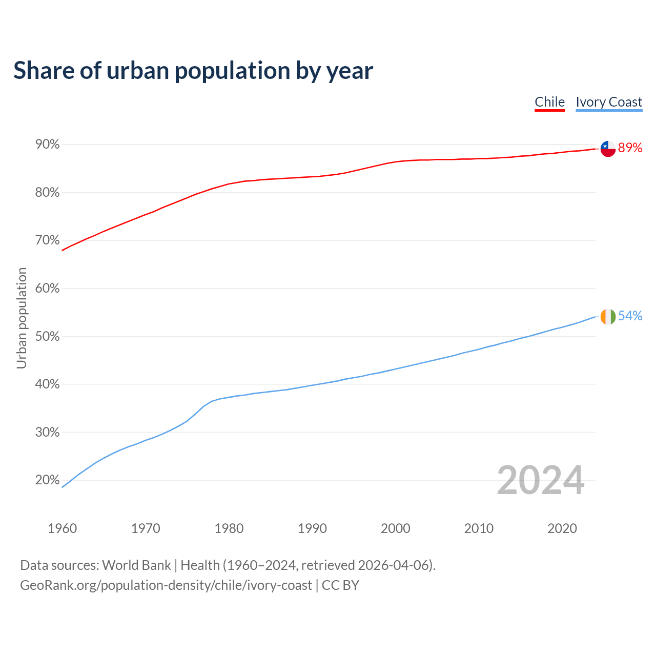 From 2004 to 2024, the share of urban population changed from 86.7% to 89% in Chile and from 44.7% to 54% in Ivory Coast.