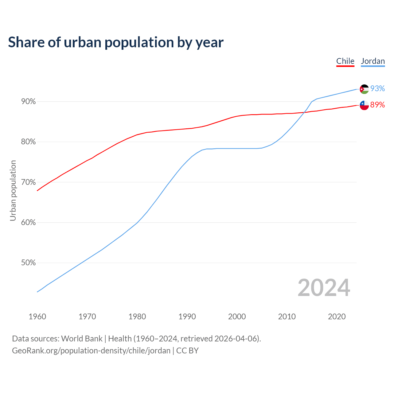 From 2004 to 2024, the share of urban population changed from 86.7% to 89% in Chile and from 78.3% to 93% in Jordan.