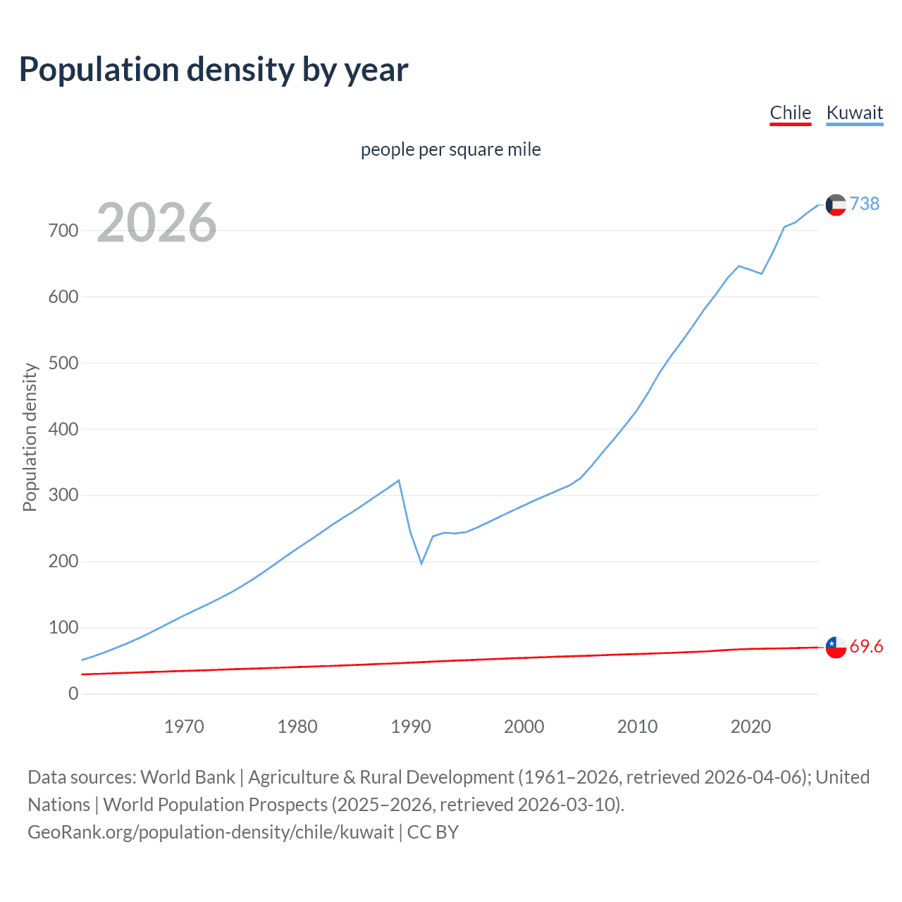 From 2006 to 2026, population density in Chile increased by 21%, compared to a 114.9% growth in Kuwait.