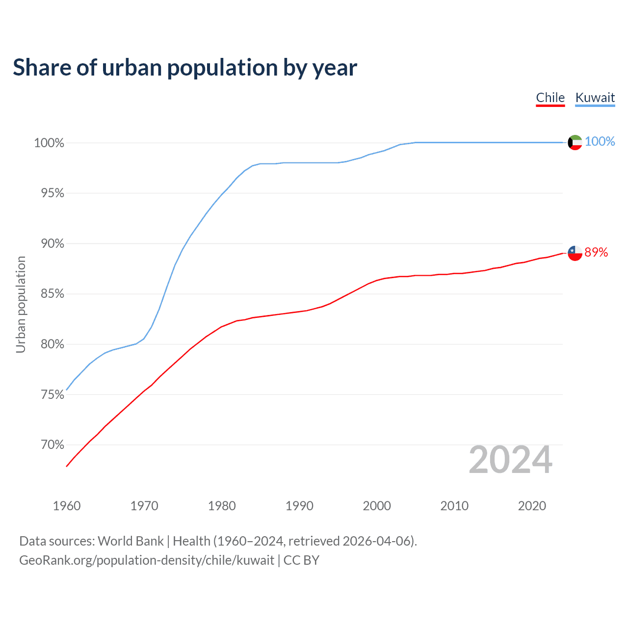 From 2004 to 2024, the share of urban population changed from 86.7% to 89% in Chile and from 99.9% to 100% in Kuwait.