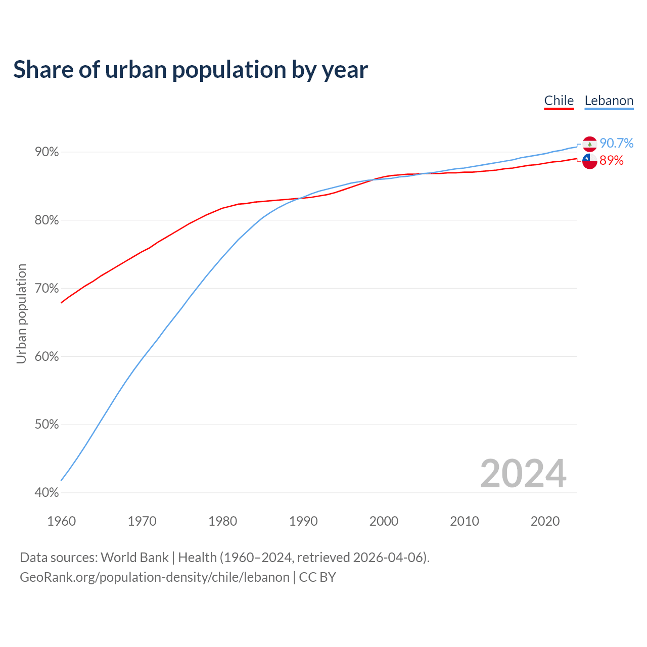 From 2004 to 2024, the share of urban population changed from 86.7% to 89% in Chile and from 86.6% to 90.7% in Lebanon.