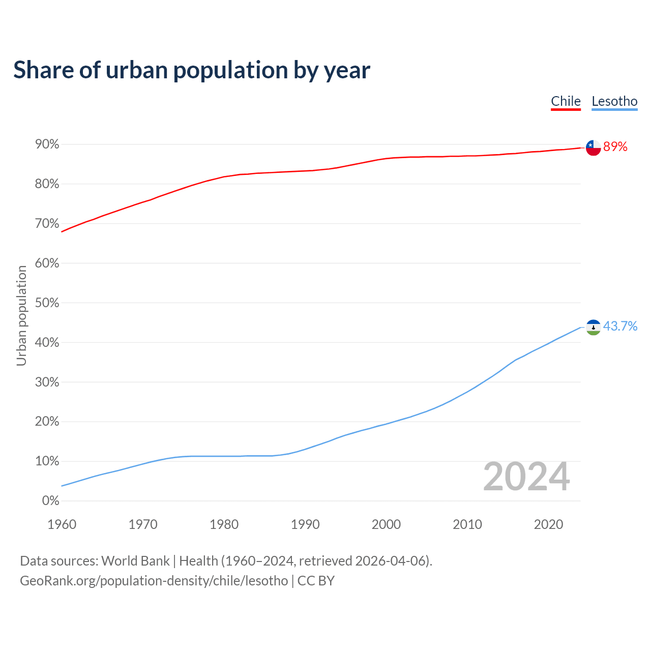 From 2004 to 2024, the share of urban population changed from 86.7% to 89% in Chile and from 21.8% to 43.7% in Lesotho.