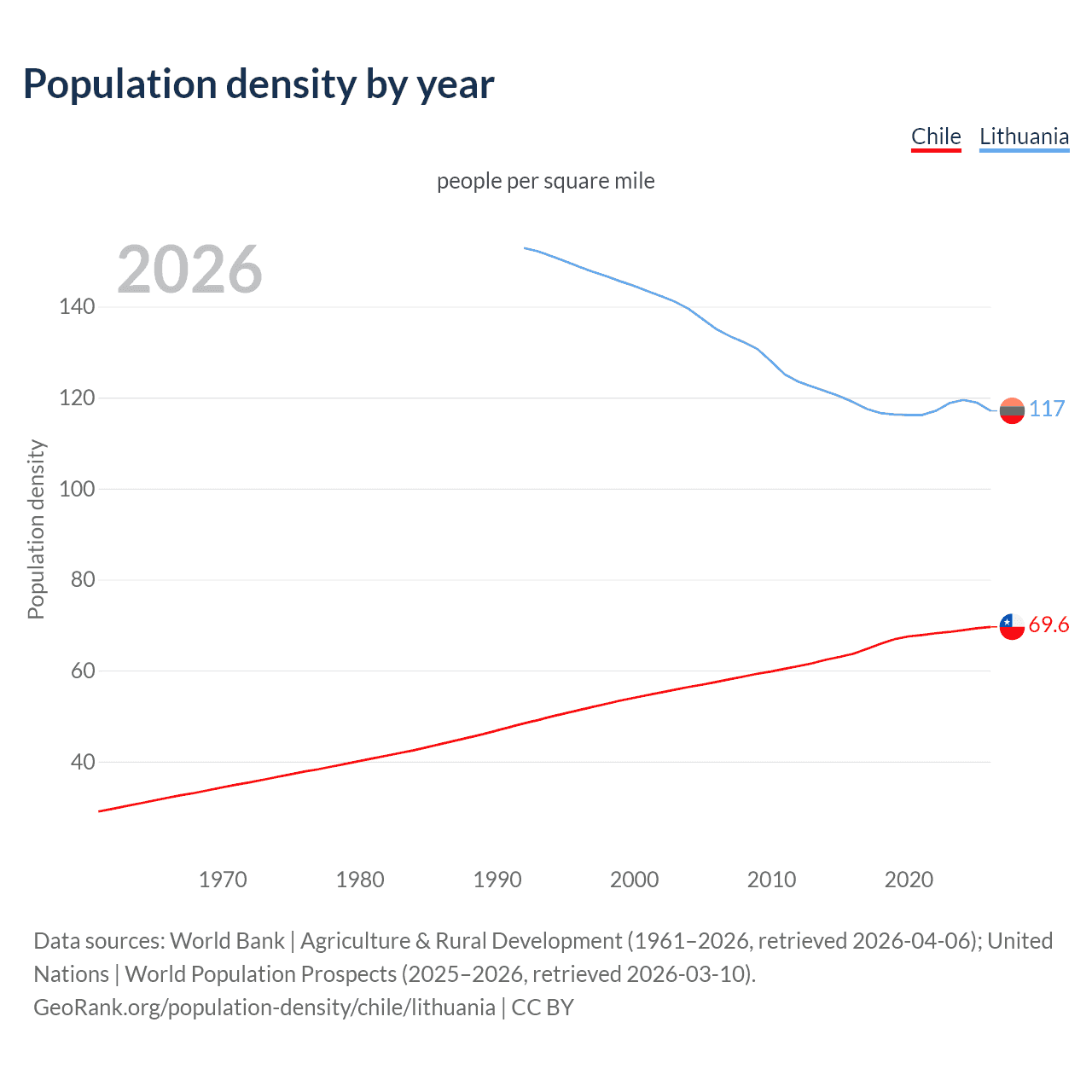 From 2006 to 2026, population density in Chile increased by 21%, compared to a 13.3% decline in Lithuania.