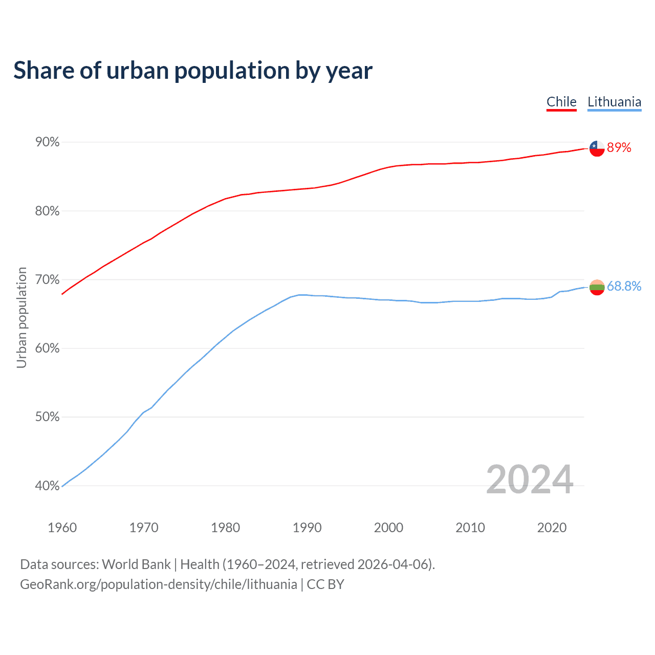 From 2004 to 2024, the share of urban population changed from 86.7% to 89% in Chile and from 66.6% to 68.8% in Lithuania.