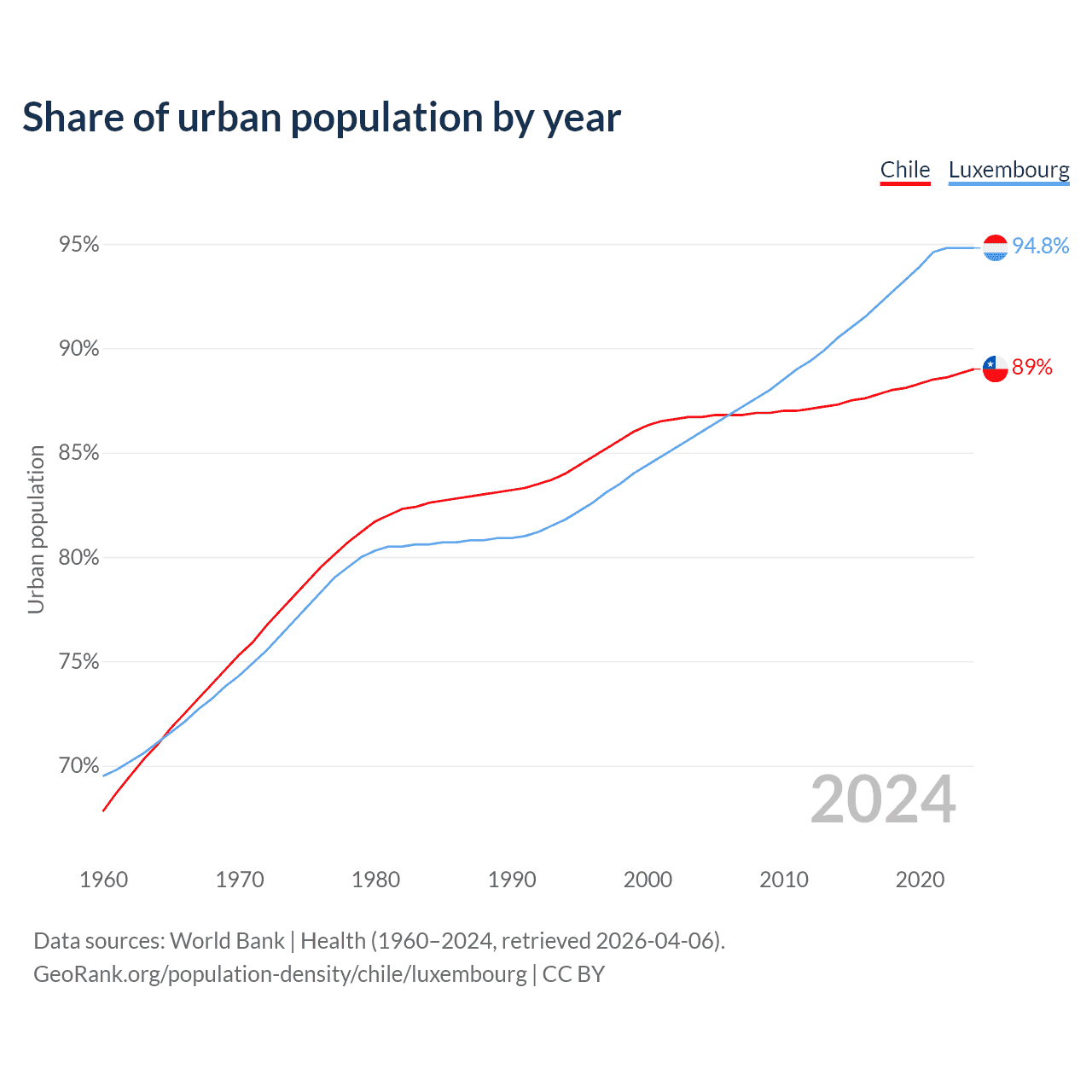 From 2004 to 2024, the share of urban population changed from 86.7% to 89% in Chile and from 86% to 94.8% in Luxembourg.