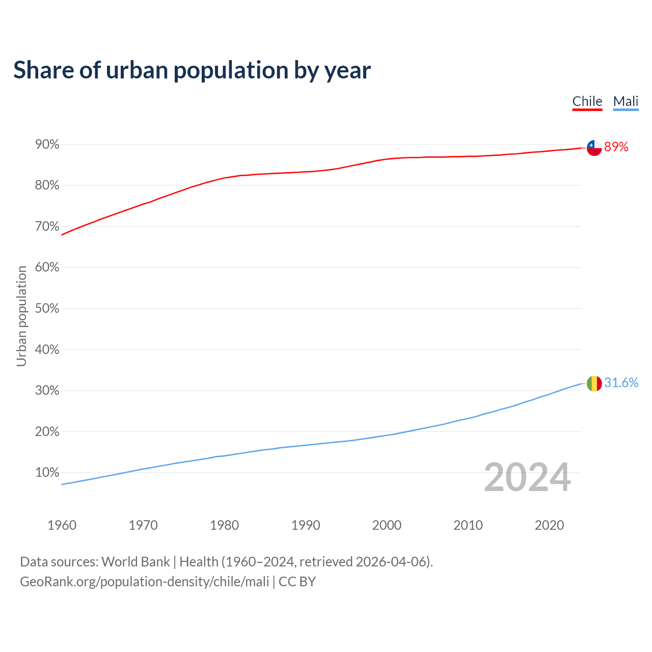 From 2004 to 2024, the share of urban population changed from 86.7% to 89% in Chile and from 20.5% to 31.6% in Mali.