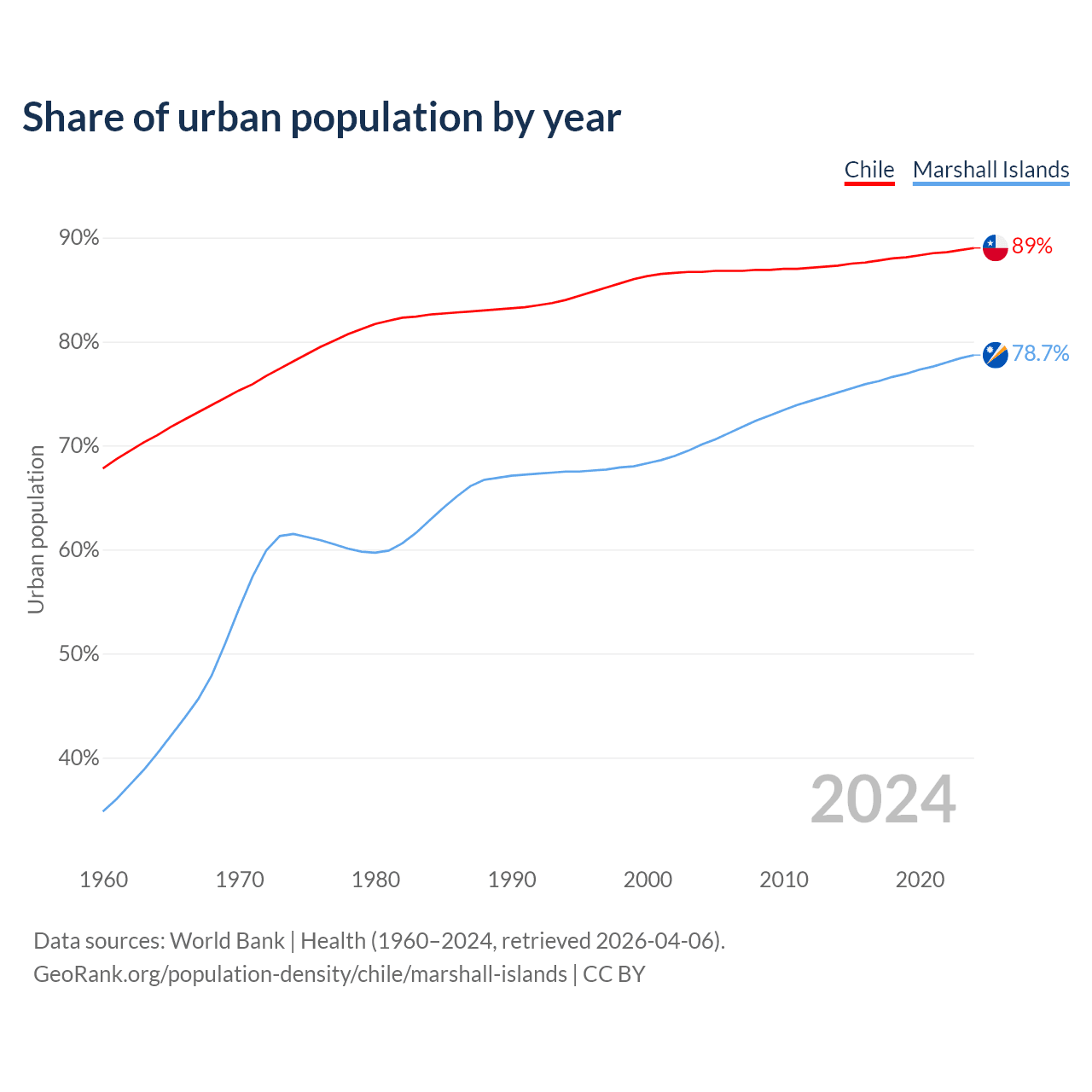 From 2004 to 2024, the share of urban population changed from 86.7% to 89% in Chile and from 70.1% to 78.7% in the Marshall Islands.