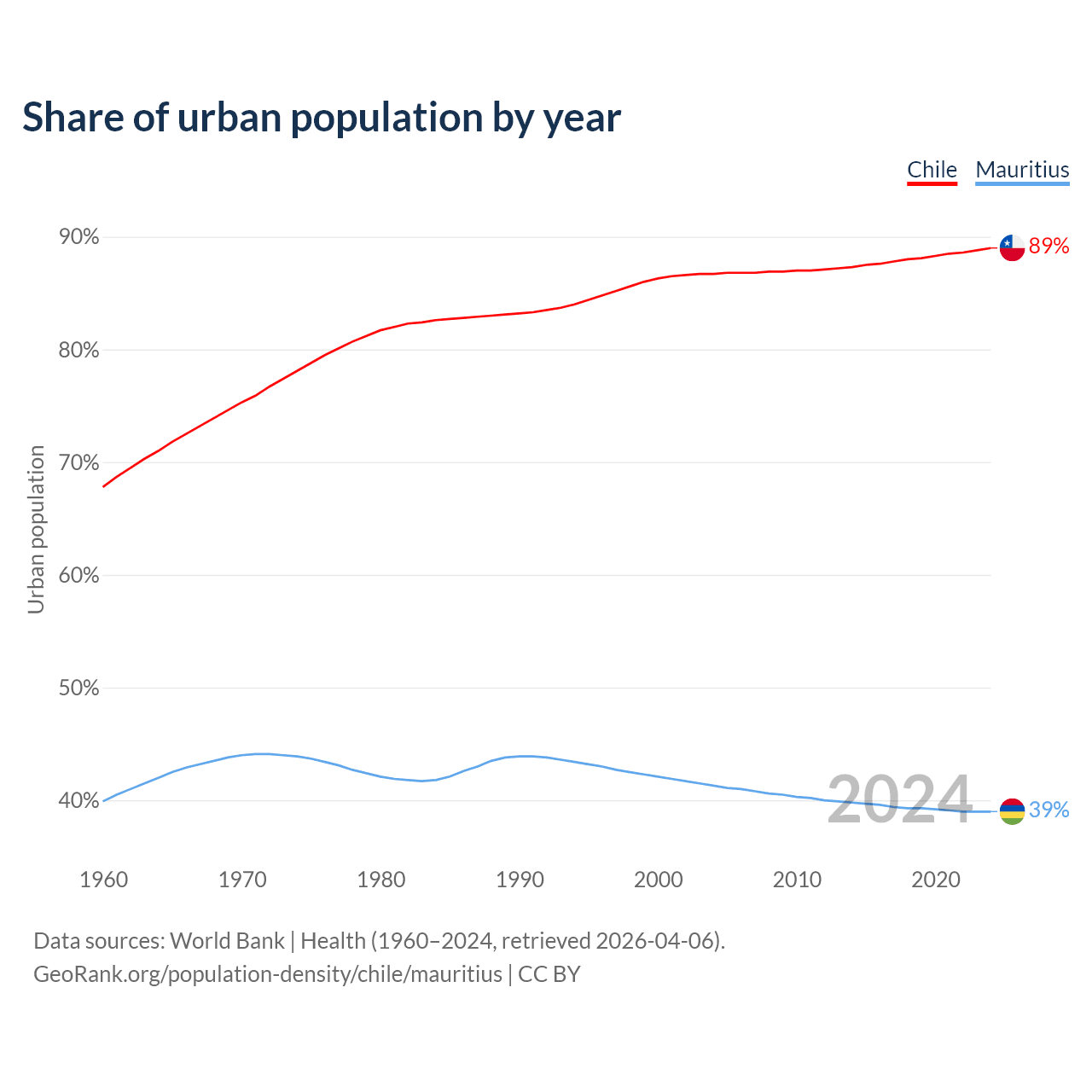 From 2004 to 2024, the share of urban population changed from 86.7% to 89% in Chile and from 41.3% to 39% in Mauritius.