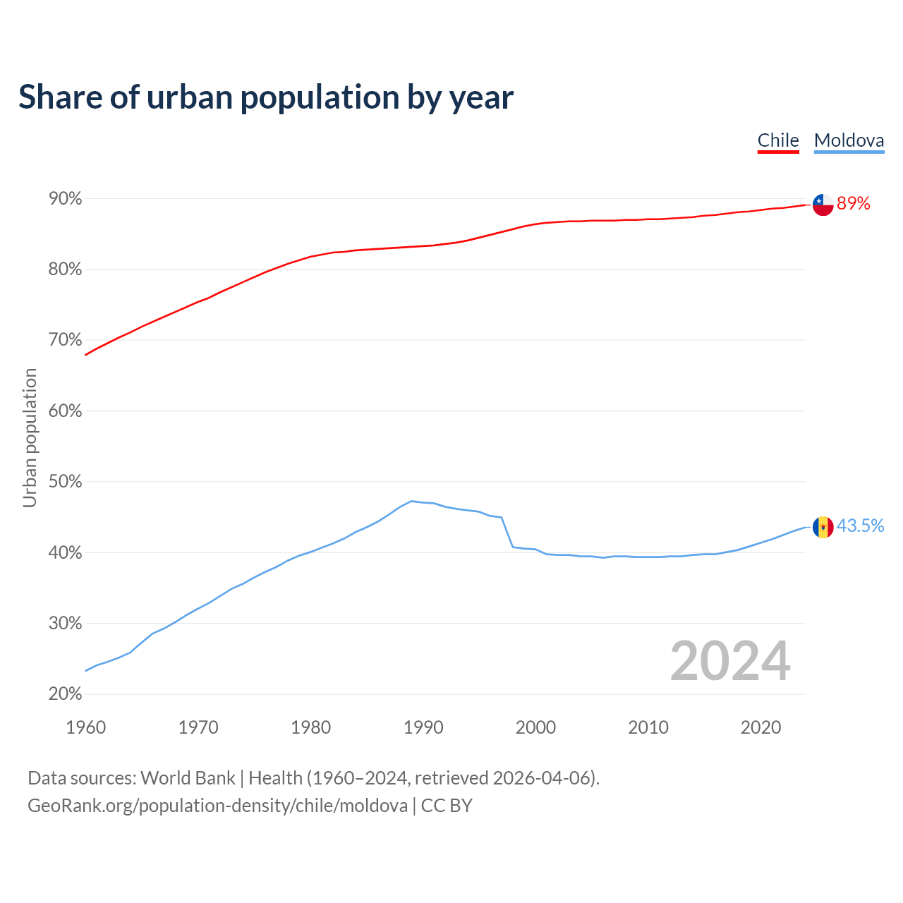 From 2004 to 2024, the share of urban population changed from 86.7% to 89% in Chile and from 39.4% to 43.5% in Moldova.