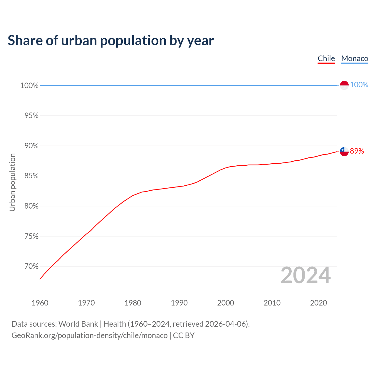 From 2004 to 2024, the share of urban population changed from 86.7% to 89% in Chile and from 100% to 100% in Monaco.