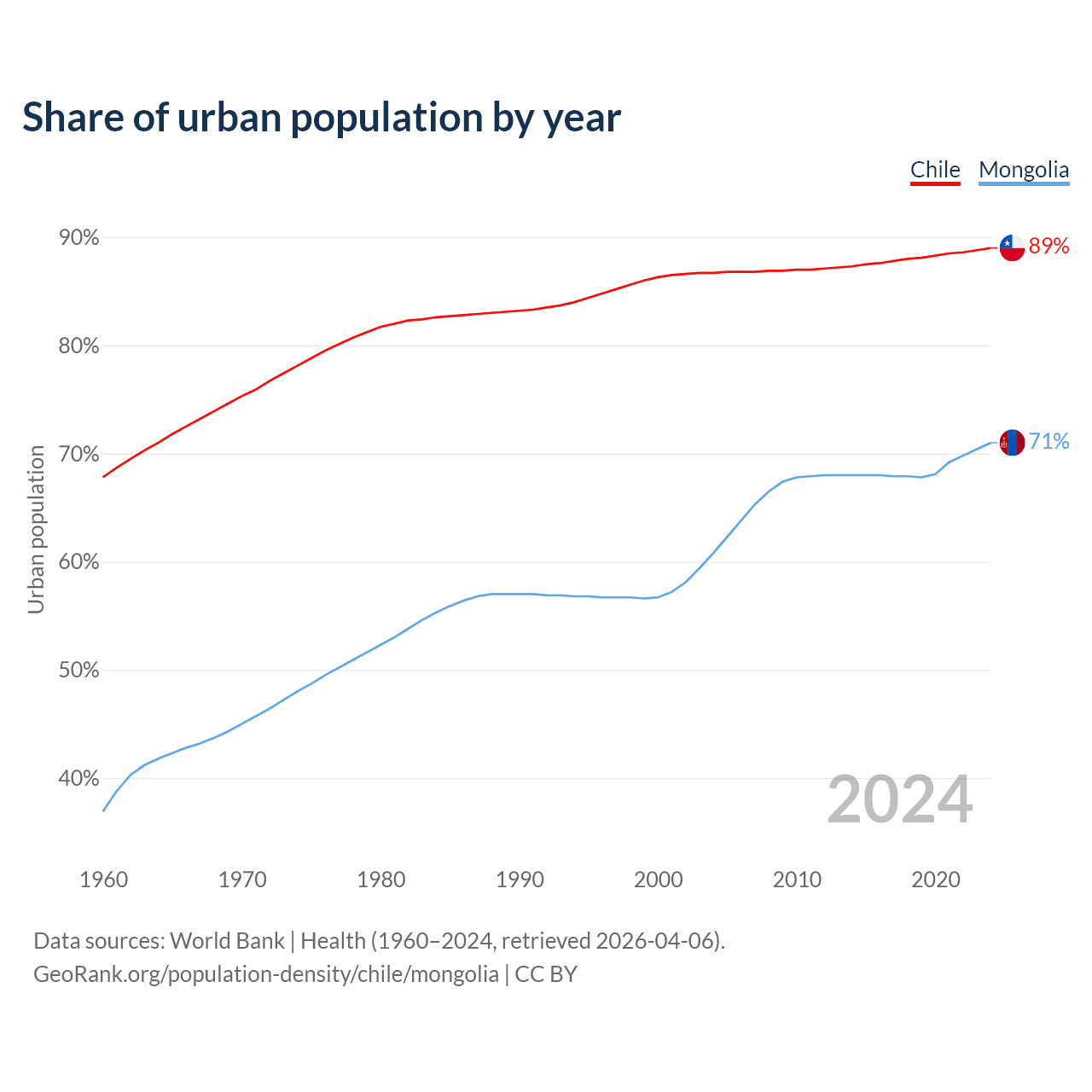 From 2004 to 2024, the share of urban population changed from 86.7% to 89% in Chile and from 60.8% to 71% in Mongolia.