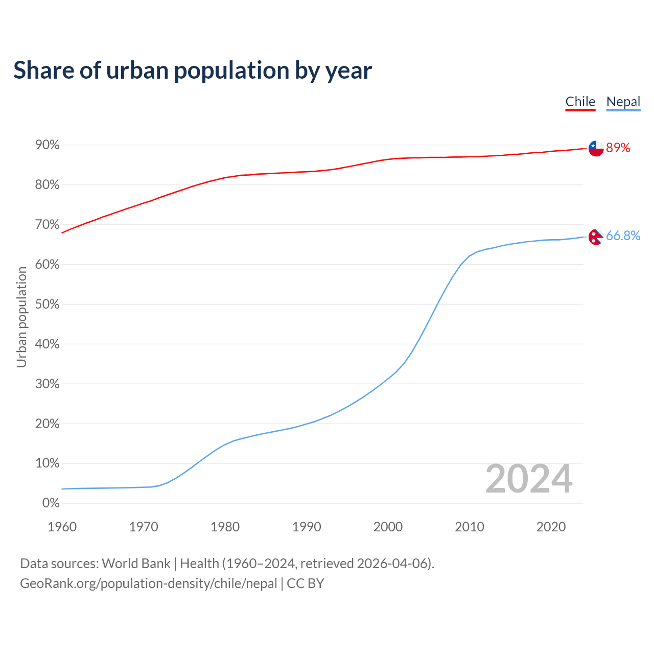 From 2004 to 2024, the share of urban population changed from 86.7% to 89% in Chile and from 41.6% to 66.8% in Nepal.