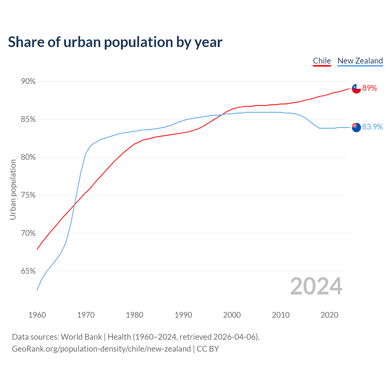 From 2004 to 2024, the share of urban population changed from 86.7% to 89% in Chile and from 85.9% to 83.9% in New Zealand.