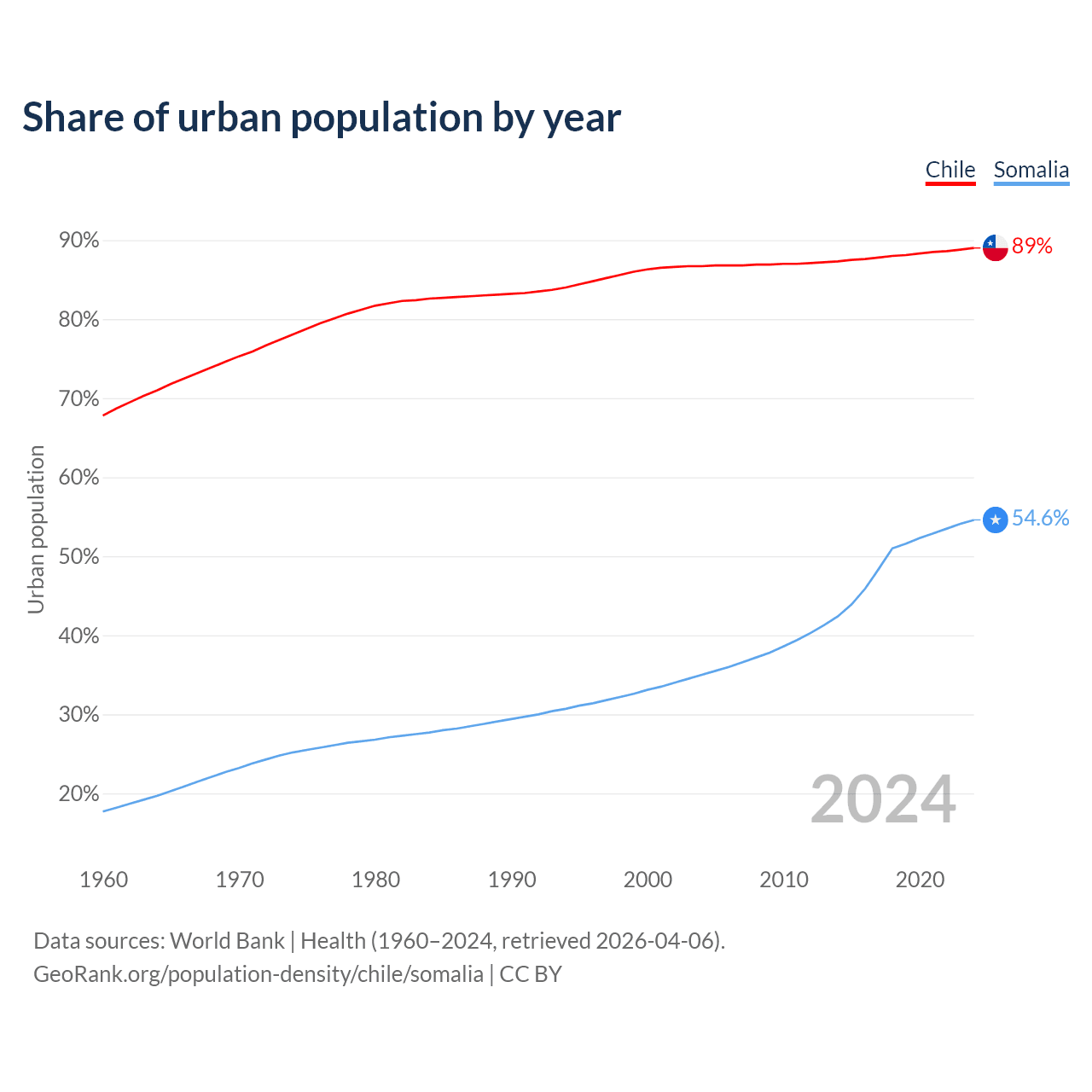 From 2004 to 2024, the share of urban population changed from 86.7% to 89% in Chile and from 35% to 54.6% in Somalia.