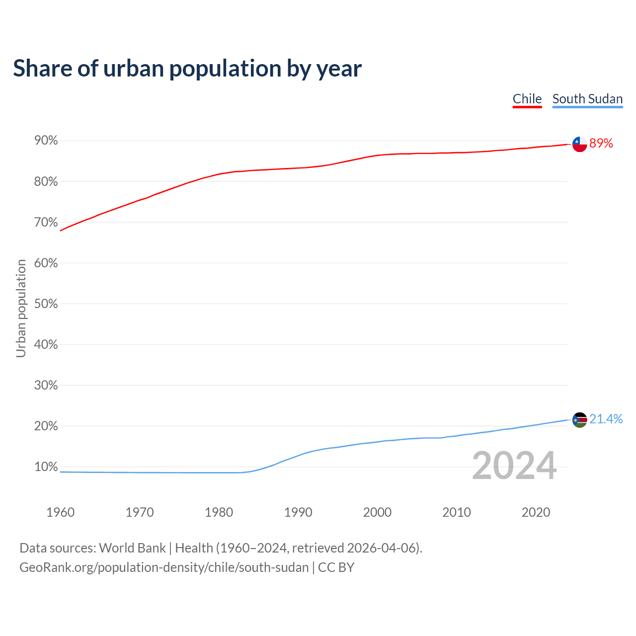 From 2004 to 2024, the share of urban population changed from 86.7% to 89% in Chile and from 16.8% to 21.4% in South Sudan.