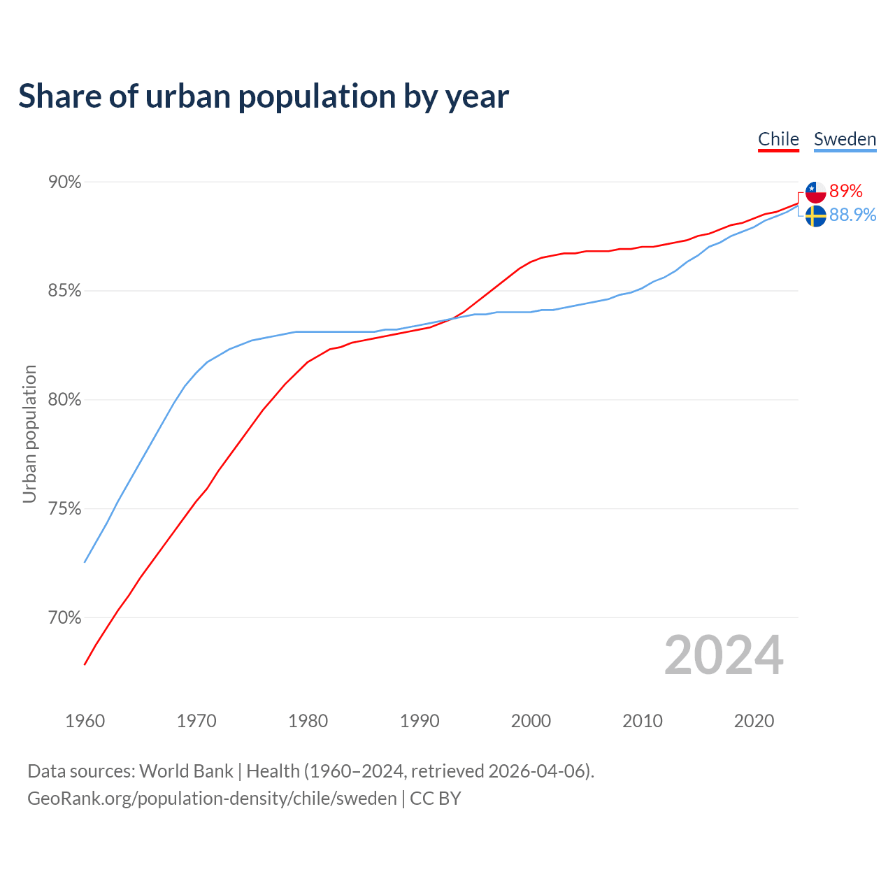 From 2004 to 2024, the share of urban population changed from 86.7% to 89% in Chile and from 84.3% to 88.9% in Sweden.