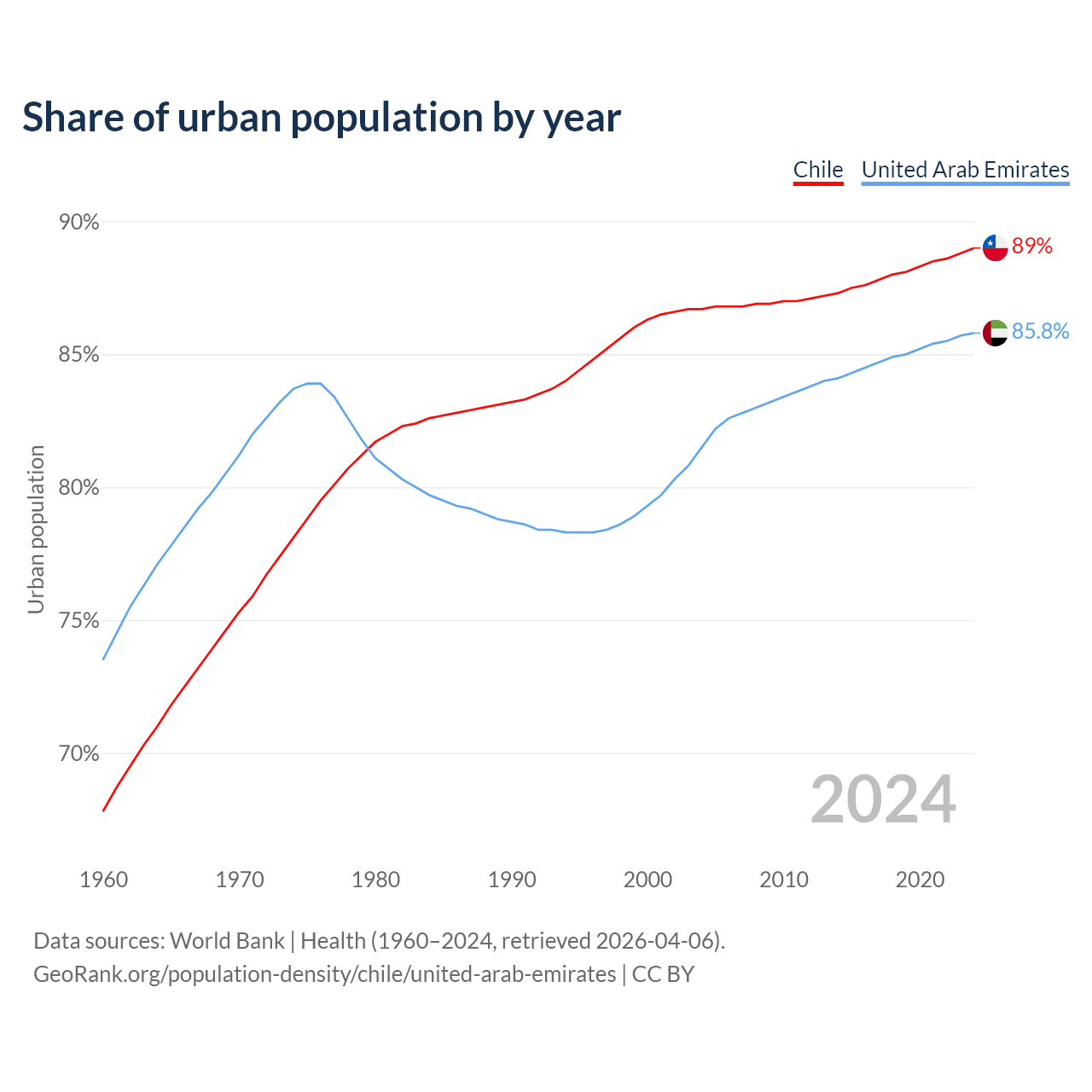 From 2004 to 2024, the share of urban population changed from 86.7% to 89% in Chile and from 81.5% to 85.8% in the United Arab Emirates.