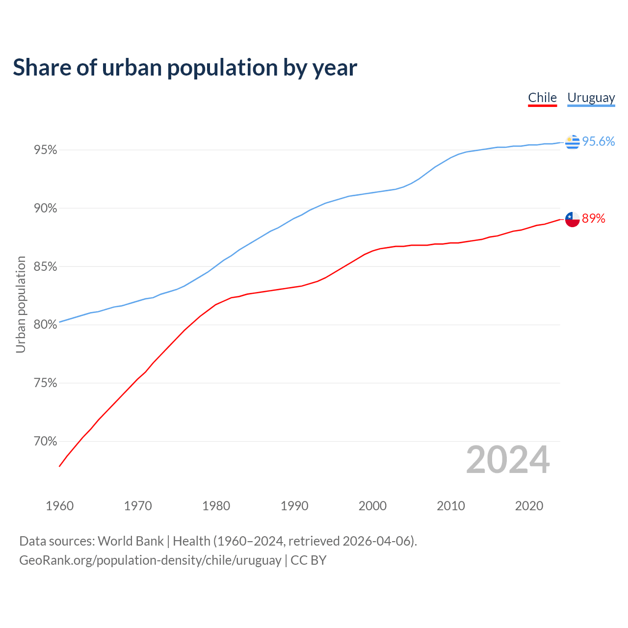 From 2004 to 2024, the share of urban population changed from 86.7% to 89% in Chile and from 91.8% to 95.6% in Uruguay.