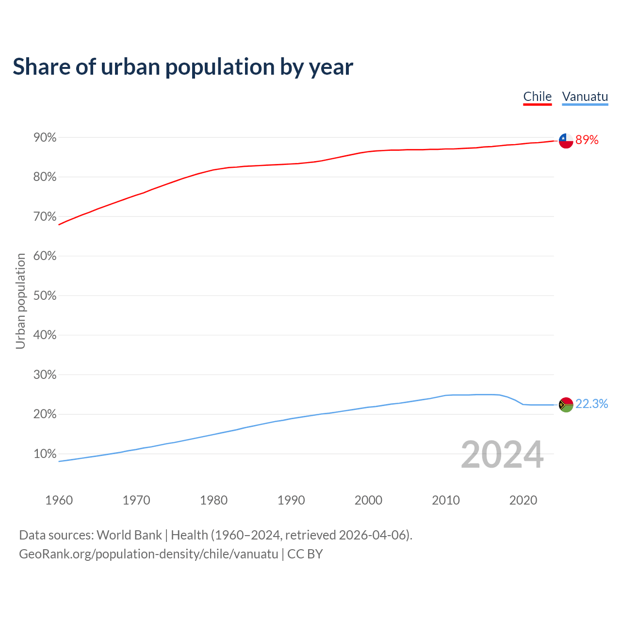 From 2004 to 2024, the share of urban population changed from 86.7% to 89% in Chile and from 22.7% to 22.3% in Vanuatu.