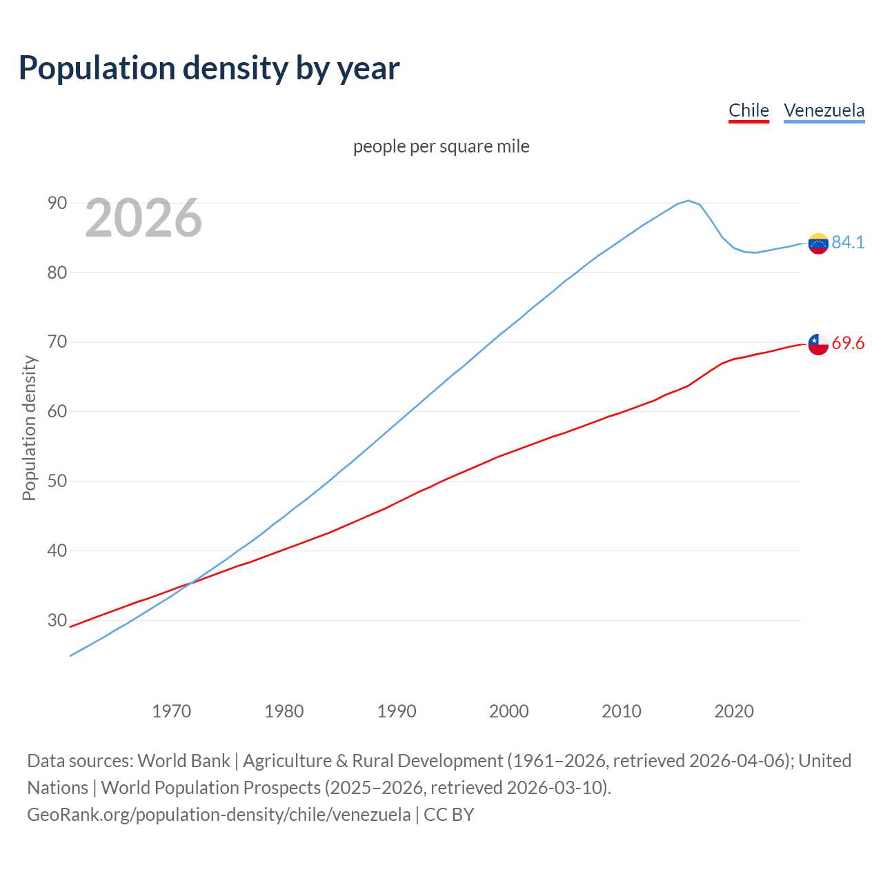 From 2006 to 2026, population density in Chile increased by 21%, compared to a 5.16% growth in Venezuela.