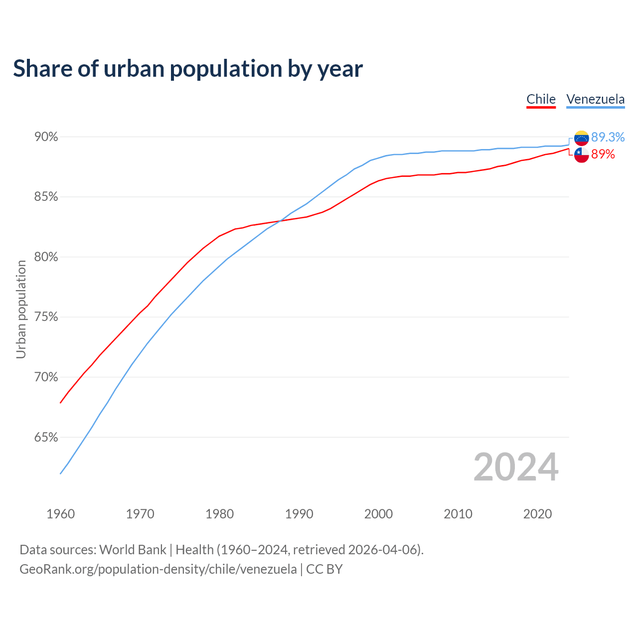 From 2004 to 2024, the share of urban population changed from 86.7% to 89% in Chile and from 88.6% to 89.3% in Venezuela.