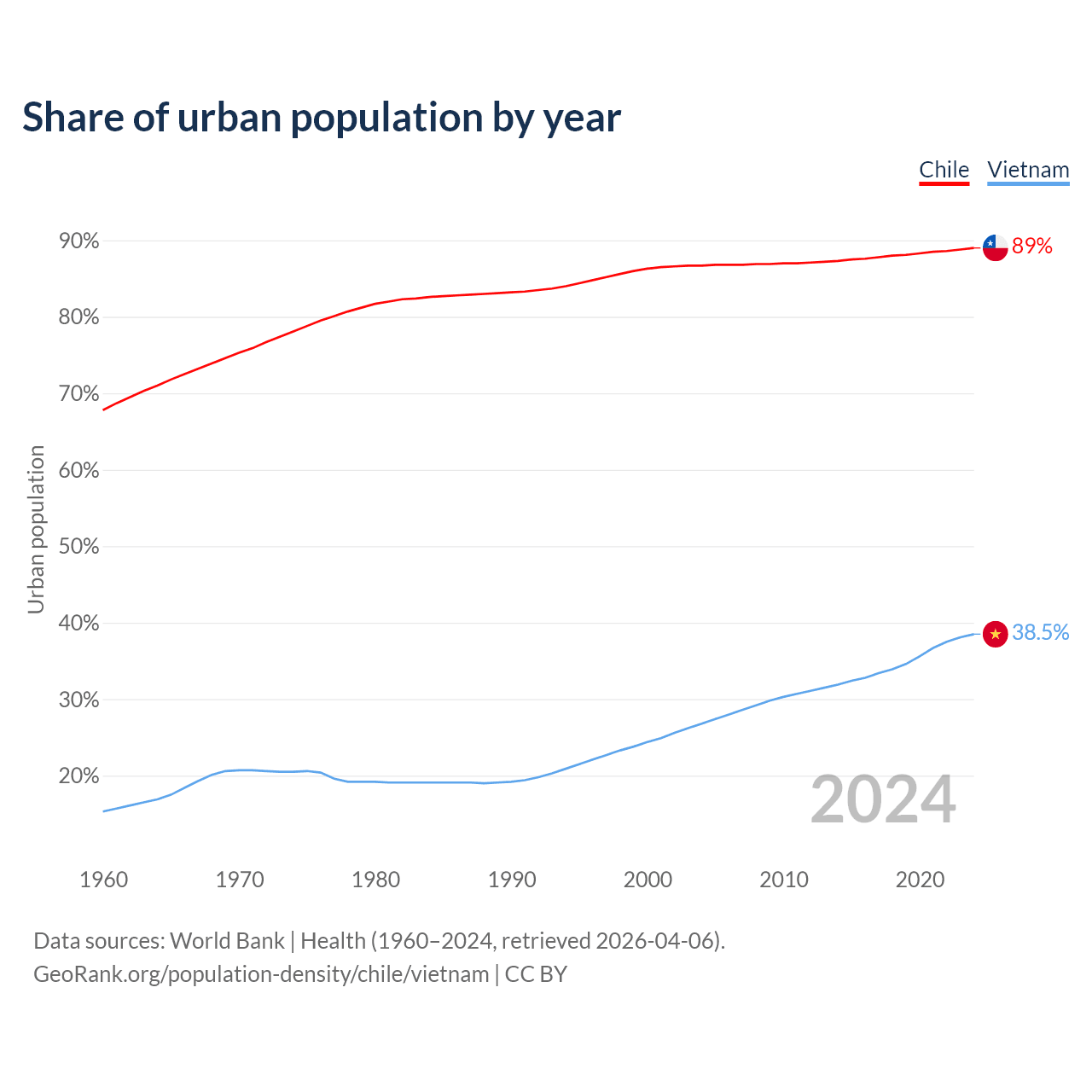 From 2004 to 2024, the share of urban population changed from 86.7% to 89% in Chile and from 26.8% to 38.5% in Vietnam.