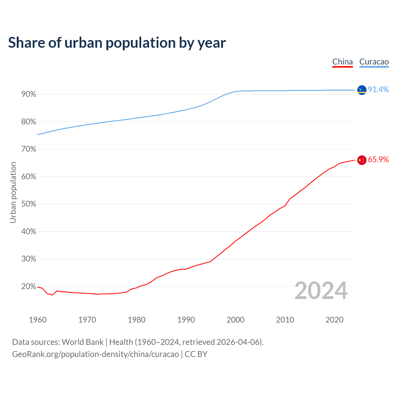From 2004 to 2024, the share of urban population changed from 41.8% to 65.9% in China and from 91.2% to 91.4% in Curacao.