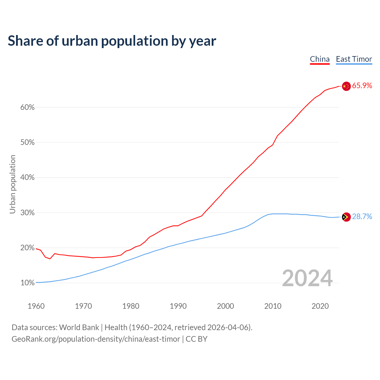 From 2004 to 2024, the share of urban population changed from 41.8% to 65.9% in China and from 25.7% to 28.7% in East Timor.