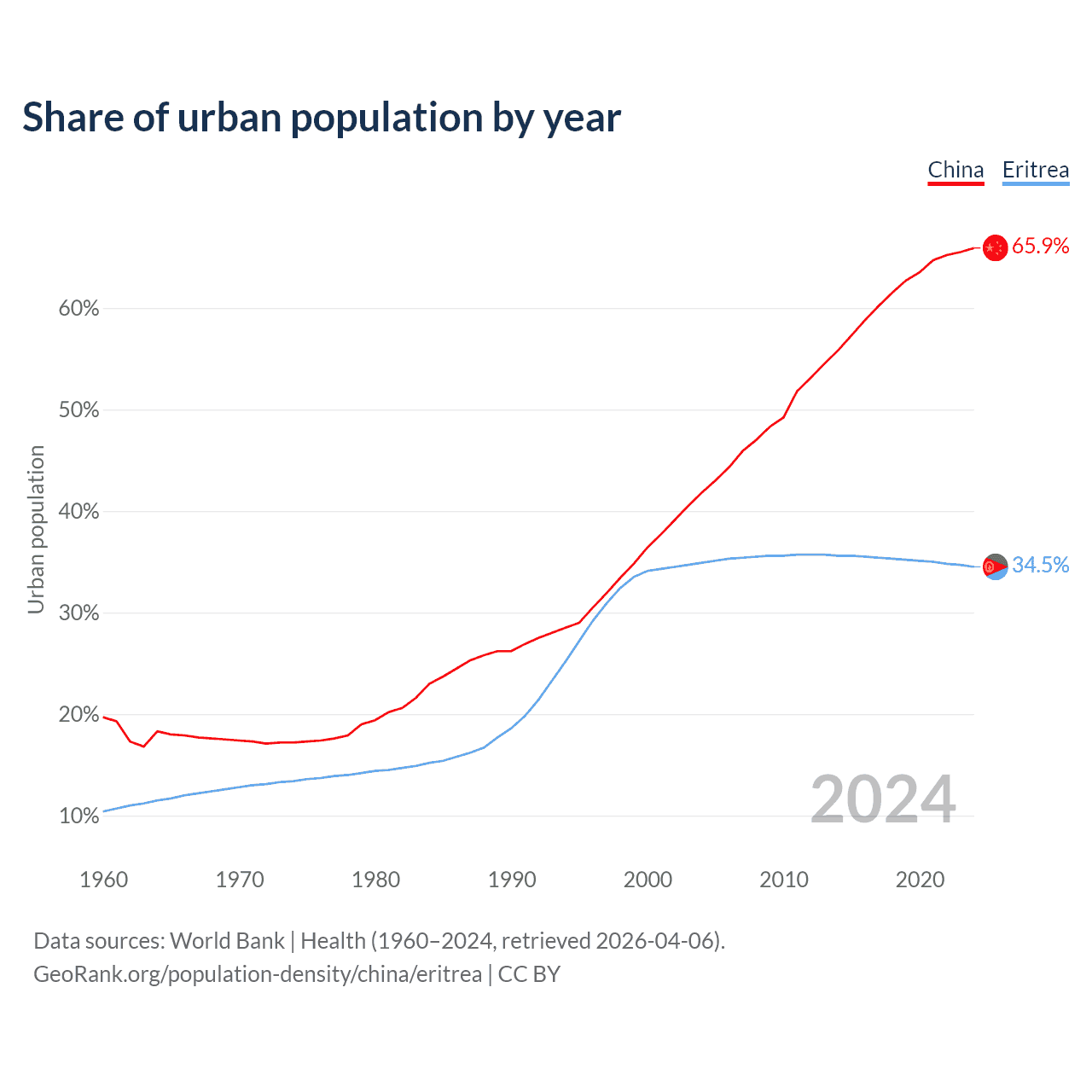 From 2004 to 2024, the share of urban population changed from 41.8% to 65.9% in China and from 34.9% to 34.5% in Eritrea.