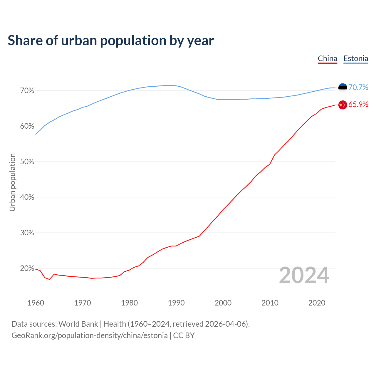 From 2004 to 2024, the share of urban population changed from 41.8% to 65.9% in China and from 67.5% to 70.7% in Estonia.