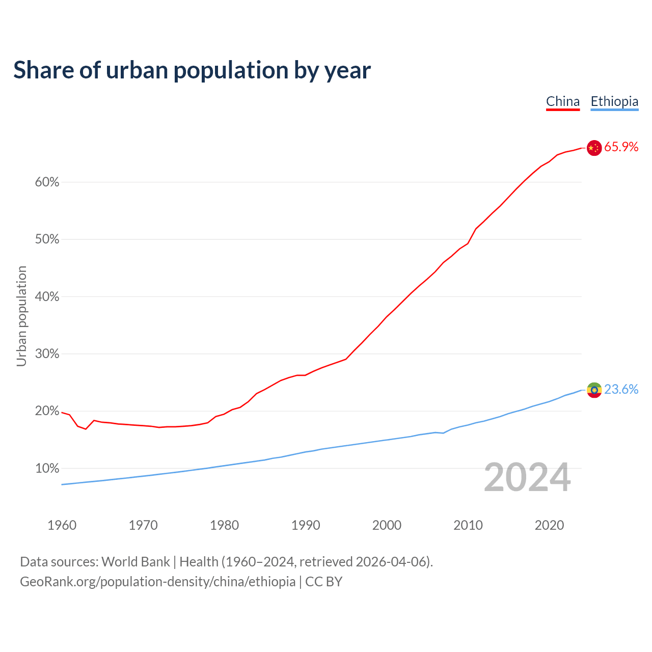 From 2004 to 2024, the share of urban population changed from 41.8% to 65.9% in China and from 15.8% to 23.6% in Ethiopia.